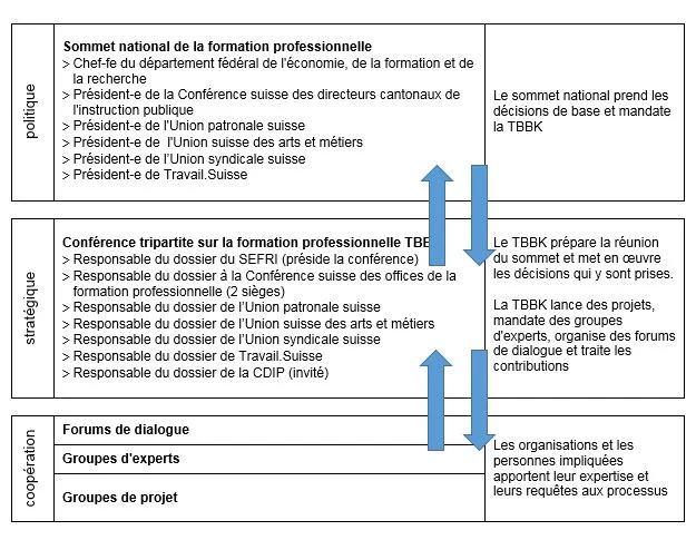 Une conférence dite tripartite sur la formation professionnelle (TBBK) est désormais responsable du pilotage stratégique central de la formation professionnelle. D'une part, elle prépare les sommets nationaux et met en œuvre les décisions qui y sont prises. D'autre part, elle lance des projets, mandate des groupes d'experts, organise des forums de dialogue et traite les contributions et les solutions proposées par ces groupes.