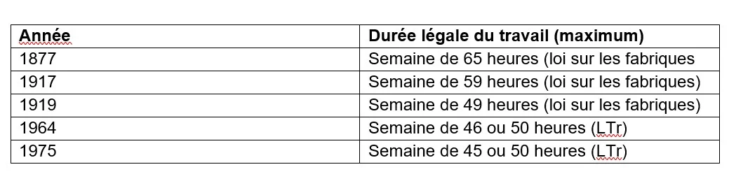 Les syndicats et les associations professionnelles mènent traditionnellement deux débats centraux, celui sur la valeur du travail et celui sur le temps de travail. La première se reflète surtout dans la question des salaires et de la répartition, le second dans la durée et la flexibilité du travail. Alors que l’on a réalisé des progrès sur la question des salaires au cours des dernières décennies, la durée légale du travail reste au niveau des années 70, avec 45 ou 50 heures. Les progrès en matière de réduction du temps de travail hebdomadaire à 42, voire 40 heures, ont uniquement été réalisés au niveau du partenariat social ou de l'entreprise. Actuellement, la durée hebdomadaire habituelle de travail pour les personnes occupées à plein temps en Suisse est de 42,7 heures par semaine - un record européen.